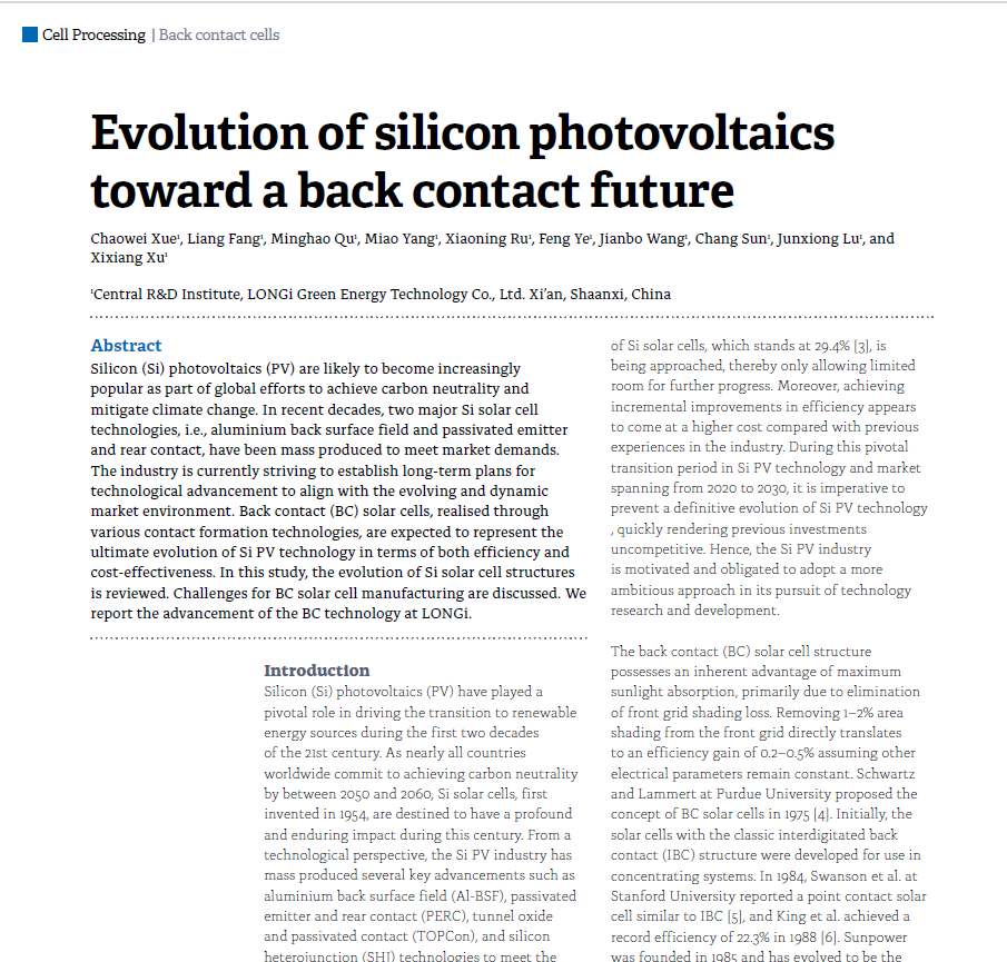 Silicon (Si) photovoltaics (PV) are likely to become increasingly popular as part of global efforts to achieve carbon neutrality and mitigate climate change. In recent decades, two major Si solar cell technologies, i.e., aluminium back surface field and passivated emitter and rear contact, have been mass produced to meet market demands. The industry is currently striving to establish long-term plans for technological advancement to align with the evolving and dynamic market environment. Back contact (BC) solar cells, realised through various contact formation technologies, are expected to represent the ultimate evolution of Si PV technology in terms of both efficiency and cost-effectiveness. In this study, the evolution of Si solar cell structures is reviewed. Challenges for BC solar cell manufacturing are discussed. We report the advancement of the BC technology at LONGi.