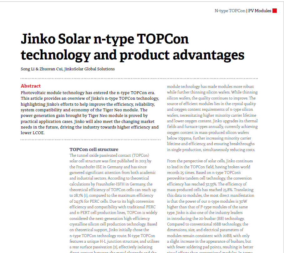 Photovoltaic module technology has entered the n-type TOPCon era. This article provides an overview of Jinko’s n-type TOPCon technology, highlighting Jinko’s efforts to help improve the efficiency, reliability, system compatibility and economy of the Tiger Neo module. The power generation gain brought by Tiger Neo module is proved by practical application cases. Jinko will also meet the changing market needs in the future, driving the industry towards higher efficiency and lower LCOE.