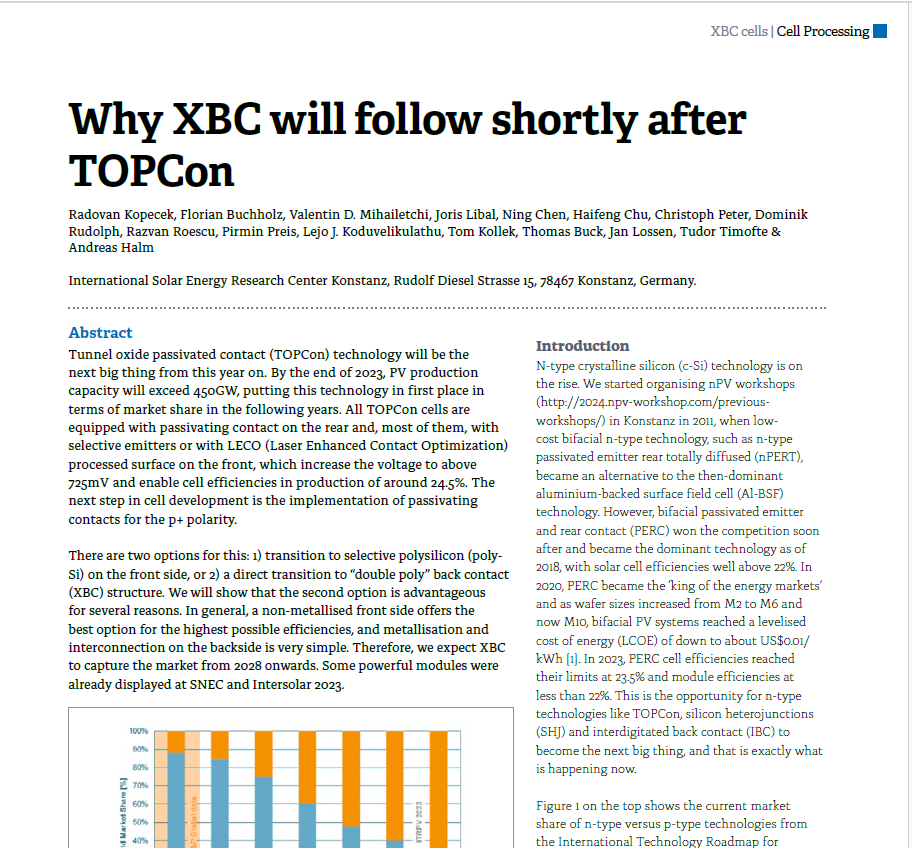 Tunnel oxide passivated contact (TOPCon) technology will be the next big thing from this year on. By the end of 2023, PV production capacity will exceed 450GW, putting this technology in first place in terms of market share in the following years. All TOPCon cells are equipped with passivating contact on the rear and, most of them, with selective emitters or with LECO (Laser Enhanced Contact Optimization) processed surface on the front, which increase the voltage to above 725mV and enable cell efficiencies in production of around 24.5%. The next step in cell development is the implementation of passivating contacts for the p+ polarity.