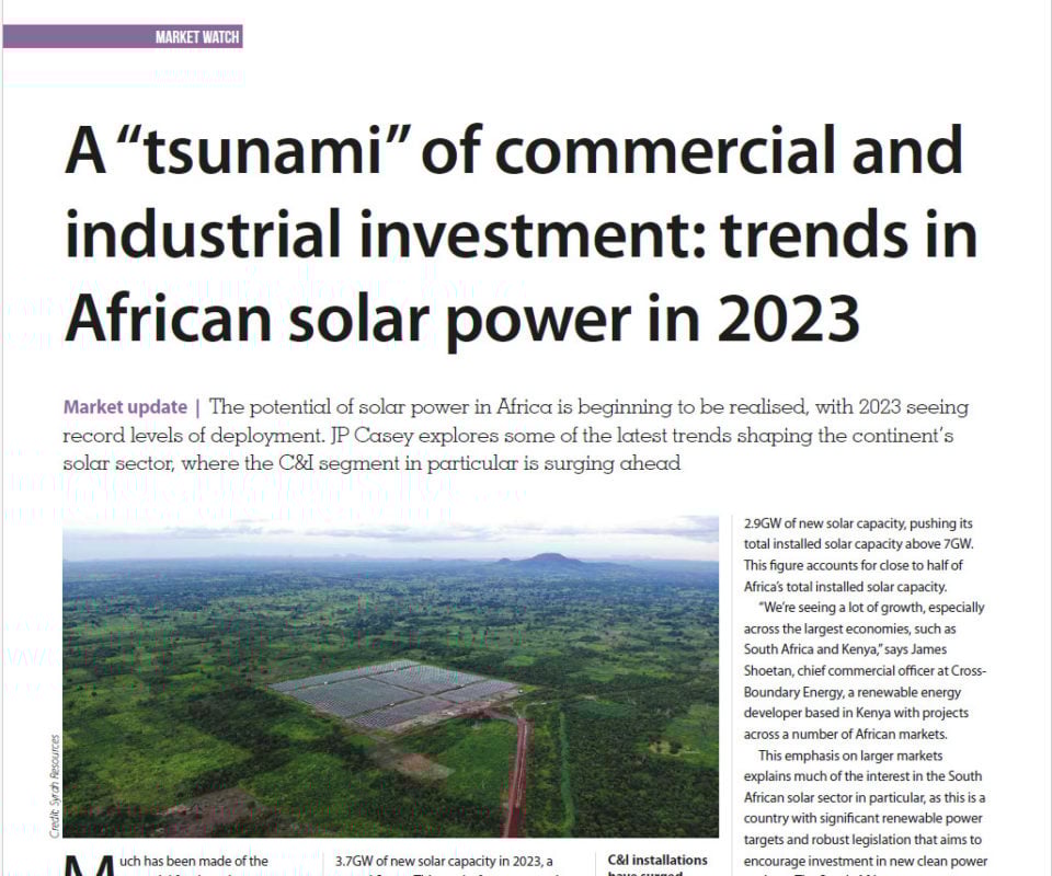 The potential of solar power in Africa is beginning to be realised, with 2023 seeing record levels of deployment. JP Casey explores some of the latest trends shaping the continent’s solar sector, where the C&I segment in particular is surging ahead.