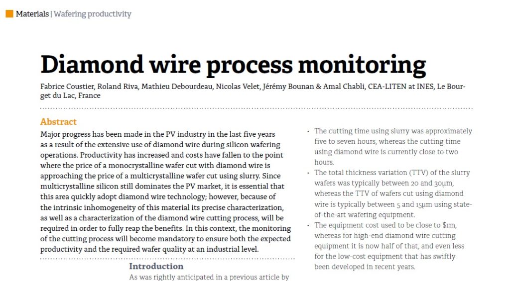 Major progress has been made in the PV industry in the last five years as a result of the extensive use of diamond wire during silicon wafering operations. Productivity has increased and costs have fallen to the point where the price of a monocrystalline wafer cut with diamond wire is approaching the price of a multicrystalline wafer cut using slurry.
