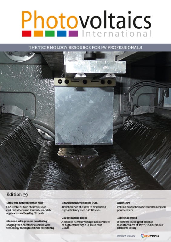 Welcome to the thirty-ninth edition of Photovoltaics International. We go to press just a few days after the conclusion of our PV CellTech conference in Penang. The focus for all the PV CTOs, chief scientists, materials providers, equipment manufacturers and others gathered for the summit was how to keep pushing the industry towards a standard 20% efficiency while also expanding in scale. That expansion ought to be 100GW in three years if demand is to be met, according to one speaker. CEA-INES researchers look at the benefits of exploiting the symmetrical a-Si/c-Si/a- Si structure of silicon heterojunction cells to use ultrathin wafers. Another innovation that delivers materials savings is of course diamond wire sawing and, again, scale and efficiency are dual drivers. Here, CEA demonstrates the need for, and processes involved in, closely monitoring the cutting process to ensure wafer quality is consistent and productivity can remain at the desired level. We look at different sides of bifacial technology (pun intended) starting with JinkoSolar’s appraisal of its mono PERC bifacial cells built using standard production technology and racking up average efficiencies of 21.8%. Away from the crystalline silicon world, German research firm OPVIUS explores how a combination of printing methods could open the door to freeform PV modules, unleashing an entirely new suite of product options and applications. ECN Solar reveals the results of an industrial-scale trial process to develop an n-type bifacial IBC solar cell that is based on tube diffusion and a simultaneous single-step screen-print of contacts at both polarities. Last but not least, CSEM looks at the impact the emerging diversity in cell technology and module architecture is having on metrology.