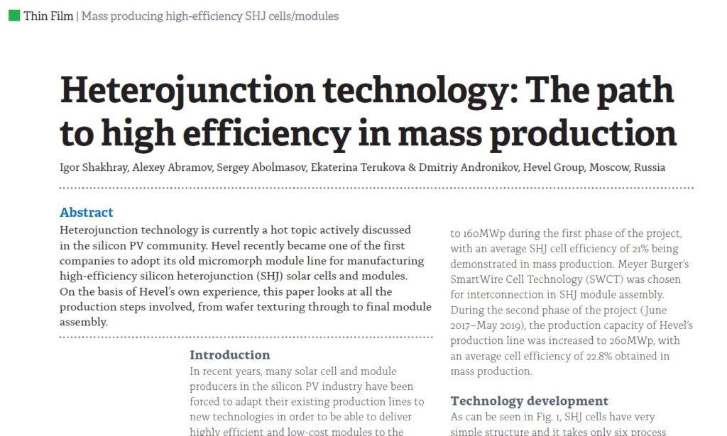 Heterojunction technology is currently a hot topic actively discussed in the silicon PV community. Hevel recently became one of the first companies to adopt its old micromorph module line for manufacturing high-efficiency silicon heterojunction (SHJ) solar cells and modules. On the basis of Hevel’s own experience, this paper looks at all the production steps involved, from wafer texturing through to final module assembly.