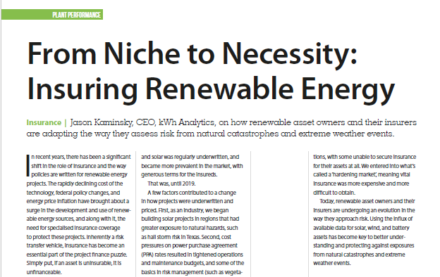 Jason Kaminsky, CEO, kWh Analytics, on how renewable asset owners and their insurers are adapting the way they assess risk from natural catastrophes and extreme weather events.