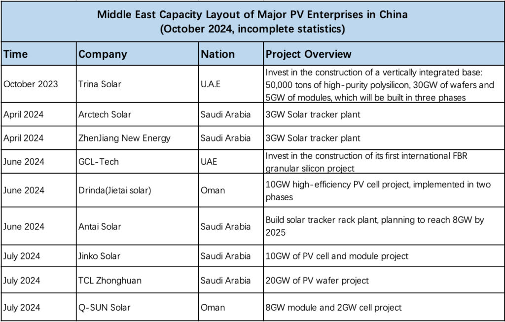According to incomplete statistics gathered by the author, Chinese PV companies such as Jinko Solar, Trina Solar, Sungrow, TCL Zhonghuan, GCL-Tech, Drinda (Jietai solar), Arctech Solar and ANTAI Solar have announced investment plans in the Middle East, involving a huge amount of money and covering the industry chain including polysilicon, wafers, cells, modules, trackers, inverters and integration projects (as shown in Table 1).