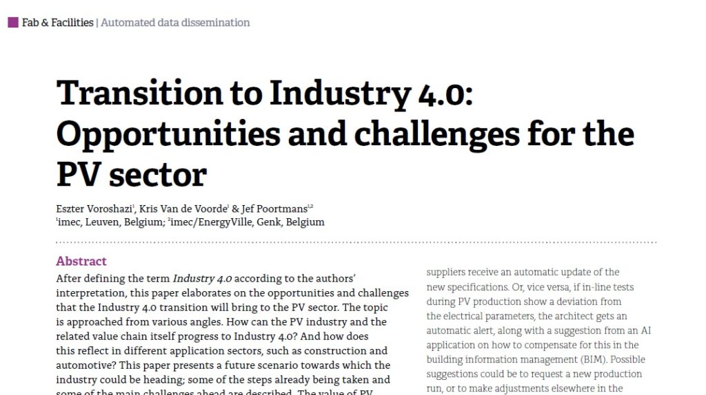 After defining the term Industry 4.0 according to the authors’ interpretation, this paper elaborates on the opportunities and challenges that the Industry 4.0 transition will bring to the PV sector. The topic is approached from various angles. How can the PV industry and the related value chain itself progress to Industry 4.0? And how does this reflect in different application sectors, such as construction and automotive? This paper presents a future scenario towards which the industry could be heading; some of the steps already being taken and some of the main challenges ahead are described. The value of PV technology as an enabler for other sectors, such as edge versus cloud computing, to move into Industry 4.0 is also touched upon. Additionally, a number of enablers and boundary conditions are highlighted in the context of Industry 4.0 and their relevance to the PV industry (legislation, cyber security, etc.) The status of Industry 4.0 in PV compared with other sectors is also explored. Wherever appropriate and possible, examples of projects and activities that illustrate the described topics are given.