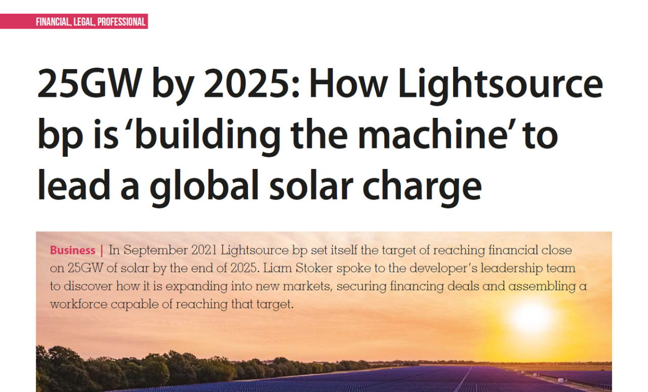 In September 2021 Lightsource bp set itself the target of reaching financial close on 25GW of solar by the end of 2025. Liam Stoker spoke to the developer’s leadership team to discover how it is expanding into new markets, securing financing deals and assembling a workforce capable of reaching that target.