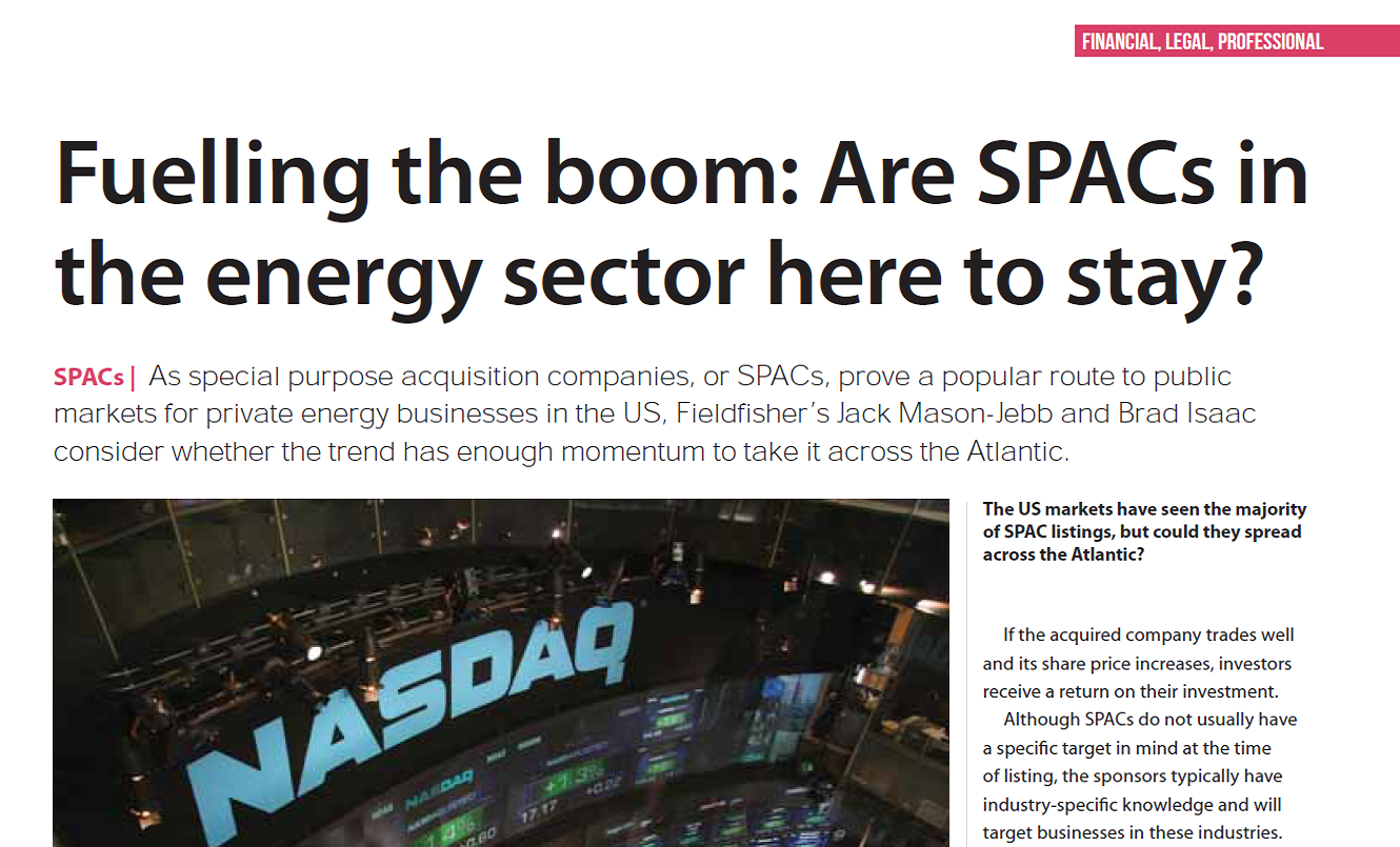 As special purpose acquisition companies, or SPACs, prove a popular route to public markets for private energy businesses in the US, Fieldfisher’s Jack Mason-Jebb and Brad Isaac consider whether the trend has enough momentum to take it across the Atlantic.
