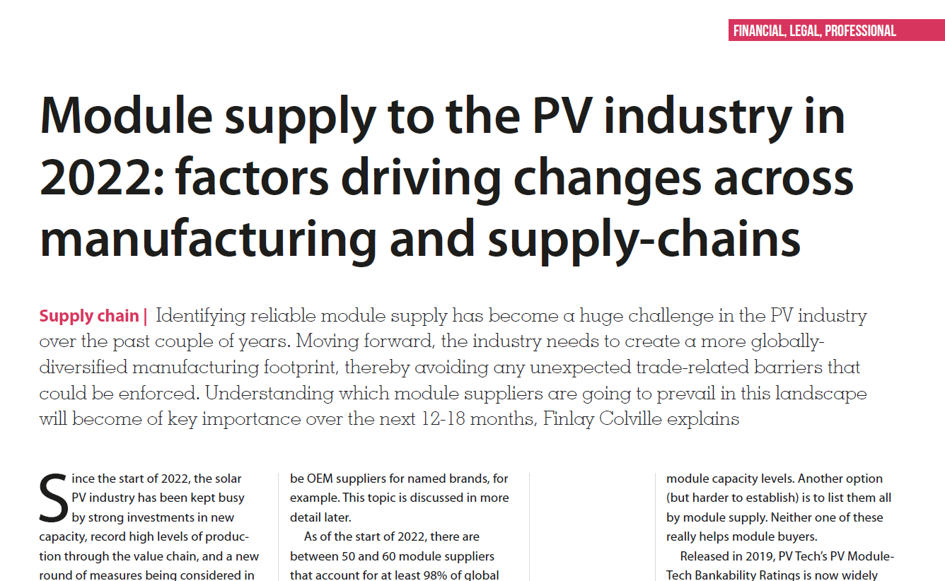 Identifying reliable module supply has become a huge challenge in the PV industry over the past couple of years. Moving forward, the industry needs to create a more globallydiversified manufacturing footprint, thereby avoiding any unexpected trade-related barriers that could be enforced. Understanding which module suppliers are going to prevail in this landscape will become of key importance over the next 12-18 months, Finlay Colville explains.