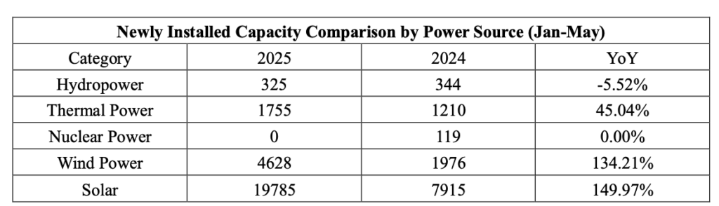 Driven by a rush to connect projects by the end of May when new energy market rules came into effect, China’s newly added PV capacity has set another record. From January to May 2025, newly installed PV capacity reached 197.85 million kilowatts (197.85GW), up 150% year-on-year. China’s cumulative PV capacity officially surpassed 1TW (108,445 million kilowatts).