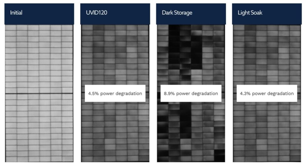 Finally, these laboratory observations have been validated through field exposure testing, particularly for TOPCon and HJT BOMs. In Kiwa PVEL’s Field Exposure test in Davis, California, some modules showed up to 8% power loss after one year, with a median power loss of 2%. Given that combined losses from LID and LETID were below 1% for these BOMs, and electroluminescence (EL) imaging revealed a distinct checkerboard degradation pattern, UVID was identified as the primary driver of this performance decline. These findings highlight a real-world reliability challenge for emerging n-type technologies that must be addressed as the industry scales.